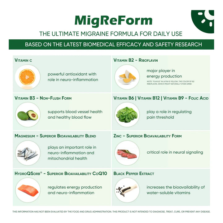 ¿Cansado de los dolores de cabeza insoportables que arruinan tus días? Imagina despertar cada mañana con claridad mental, energía renovada y sin el temor a que la migraña te sorprenda. MigReForm no es solo un suplemento, es tu aliado diario para recuperar el control de tu bienestar. Formulado por médicos y respaldado por décadas de investigación, este multivitamínico de alta biodisponibilidad está diseñado para abordar las migrañas desde su raíz, proporcionando alivio en cada fase del ciclo.