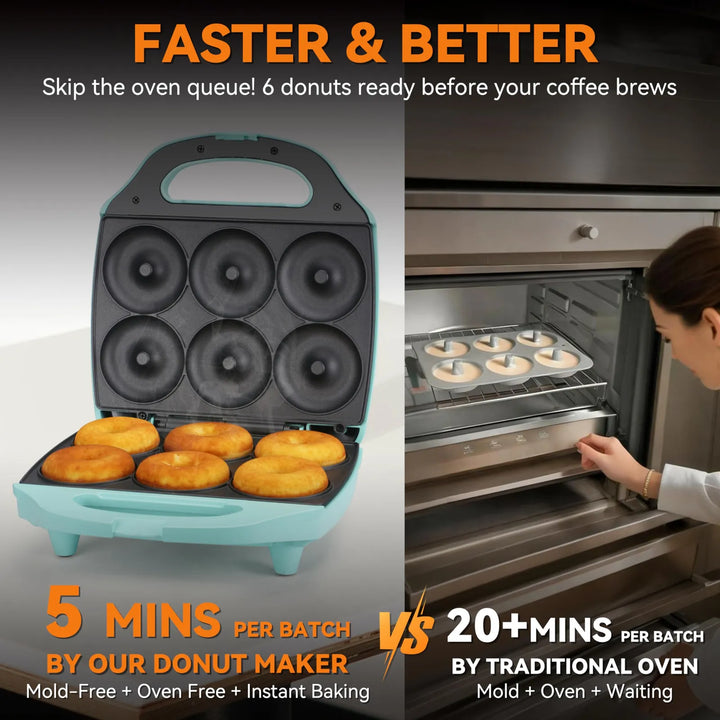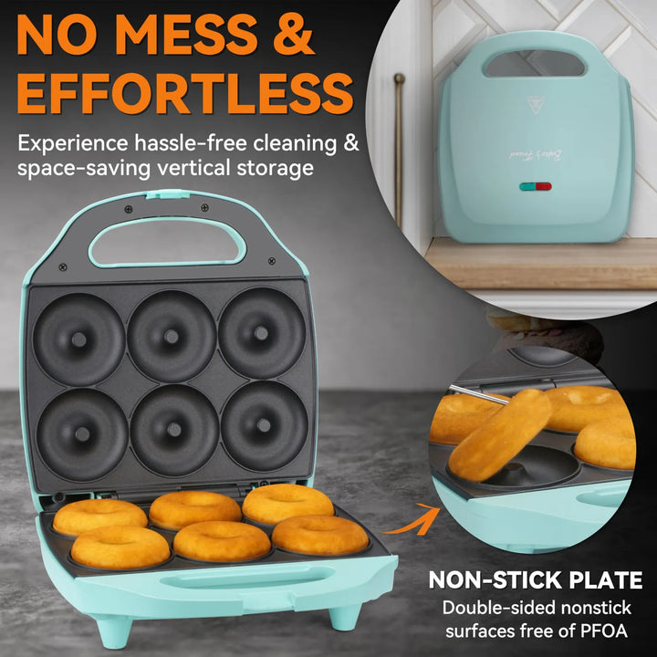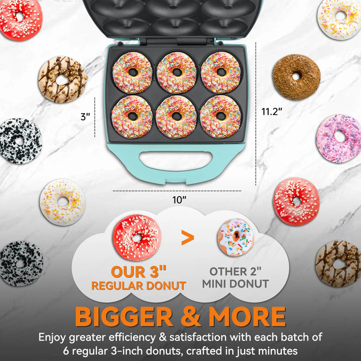 ¿Cansado de las donas pequeñas y secas de las máquinas tradicionales? Nuestra máquina produce donas de 3 pulgadas, perfectamente doradas y deliciosas, ideales para compartir en familia o sorprender a tus invitados. Su diseño compacto y elegante en tono aguamarina se integra perfectamente en cualquier cocina, sin ocupar espacio innecesario.