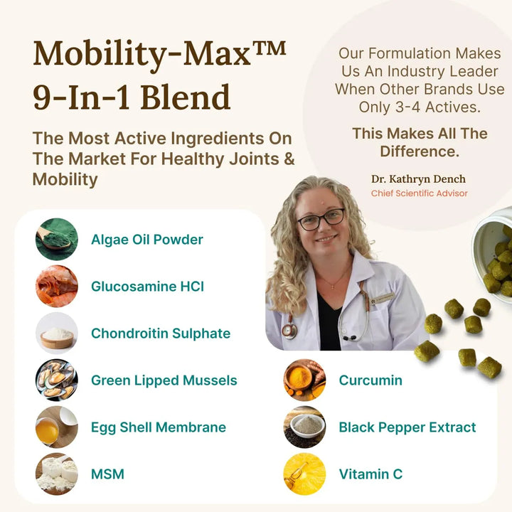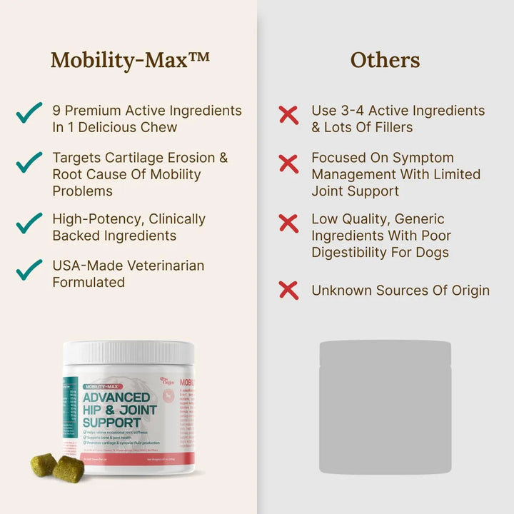 Imagina ver a tu perro jugar como cuando era cachorro, sin cojeras ni molestias. Mobility Max combina 9 ingredientes clínicamente probados, como glucosamina, condroitina y MSM, para brindar un soporte integral a sus articulaciones. Además, su delicioso sabor a tocino hace que administrarlo sea tan fácil como darle un premio. No esperes a que el problema empeore: actúa ahora y devuélvele la calidad de vida que se merece.
