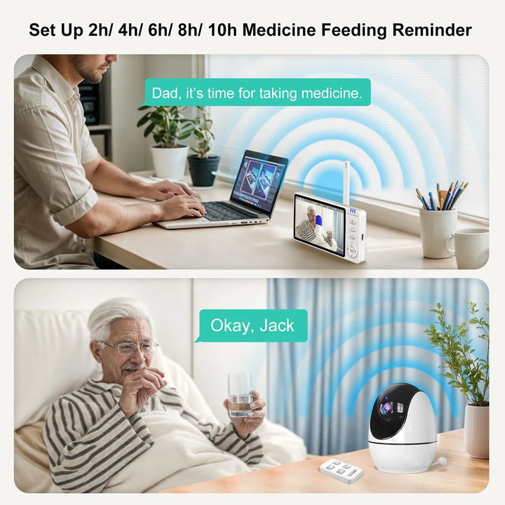 El monitor utiliza una conexión de 2.4GHz FHSS para transmitir audio y video en tiempo real. La cámara detecta movimientos inusuales, como caídas, y envía alertas inmediatas. El audio bidireccional permite comunicación instantánea, mientras que las alarmas programables aseguran que no se olviden medicamentos o necesidades básicas.