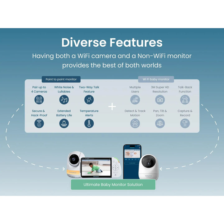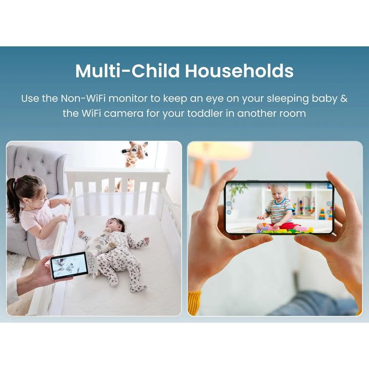 Este innovador sistema combina lo mejor de ambos mundos: una cámara Full HD sin WiFi para monitoreo interno confiable y una cámara WiFi adicional para vigilancia remota. ¿La mejor parte? Puedes usarlos simultáneamente para diferentes áreas de tu hogar, ideal para familias con múltiples niños o espacios amplios.