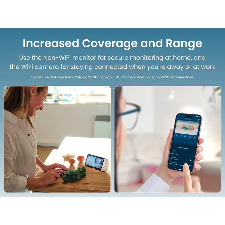El sistema utiliza dos tecnologías complementarias: una conexión punto a punto de 2.4GHz FHSS para el monitor principal (sin WiFi) que garantiza transmisión segura y estable dentro del hogar, y una cámara WiFi adicional que se conecta a tu red doméstica para acceso remoto a través de la aplicación MaxView & FullPeek.