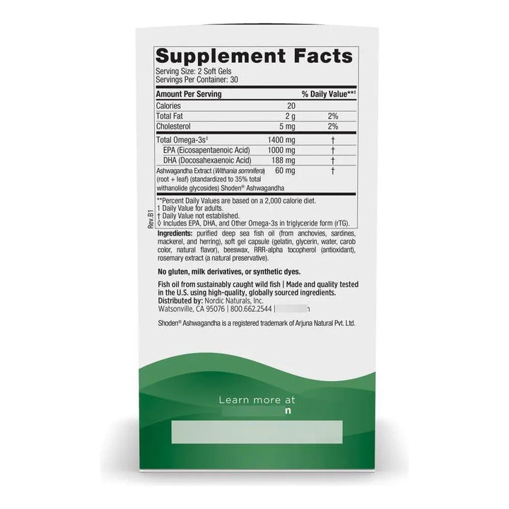 Nuestra fórmula única combina ashwagandha y omega-3 EPA en una mezcla potente que reduce el estrés, promueve un estado de ánimo estable y mejora tu función cerebral. ¿Por qué conformarte con menos cuando puedes tener lo mejor? Cada gel suave contiene 1400 mg de omega-3, incluyendo 1000 mg de EPA, para brindarte resultados tangibles desde la primera dosis. Además, está libre de OMG, gluten y lácteos, porque tu salud es nuestra prioridad.