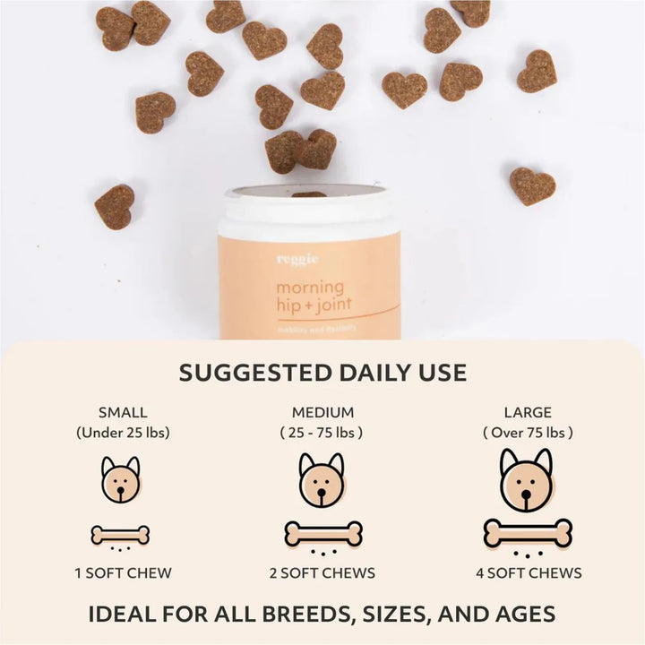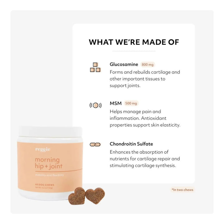 Morning Hip + Joint actúa directamente en las articulaciones de tu perro, combinando glucosamina, MSM y sulfato de condroitina para reducir la inflamación, reparar el cartílago dañado y mejorar la movilidad. Estos ingredientes trabajan sinérgicamente para aliviar el dolor y promover una recuperación natural.