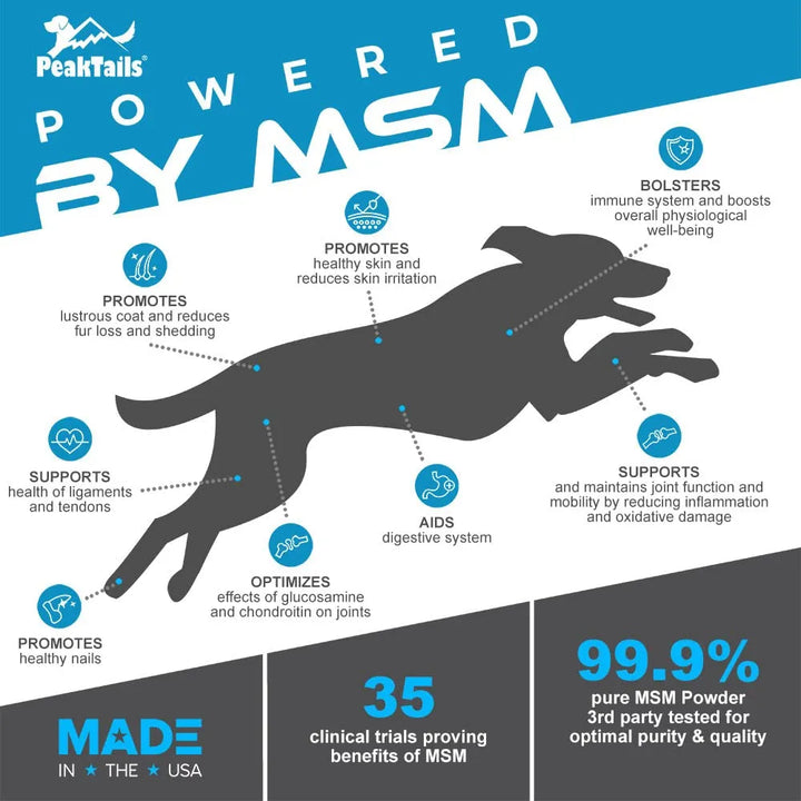 Imagina ver a tu perro saltando de felicidad como cuando era cachorro, jugando sin molestias y disfrutando cada paseo. El metilsulfonilmetano (MSM) es un compuesto de azufre esencial que actúa como un escudo protector para sus articulaciones, tendones y ligamentos. No es un simple suplemento; es un regalo de bienestar que respalda su movilidad y calidad de vida.