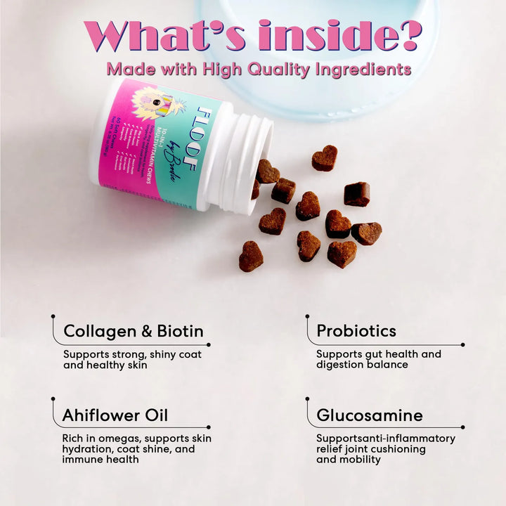 Nuestra multivitamina actúa de manera integral: los ingredientes activos como la glucosamina y el MSM reparan y protegen las articulaciones, mientras que el CoQ10 fortalece el corazón. Los probióticos mejoran la digestión desde la primera dosis, y la biotina junto al colágeno nutren la piel y el pelaje desde dentro. ¡Es como un equipo de superhéroes trabajando para la salud de tu perro!