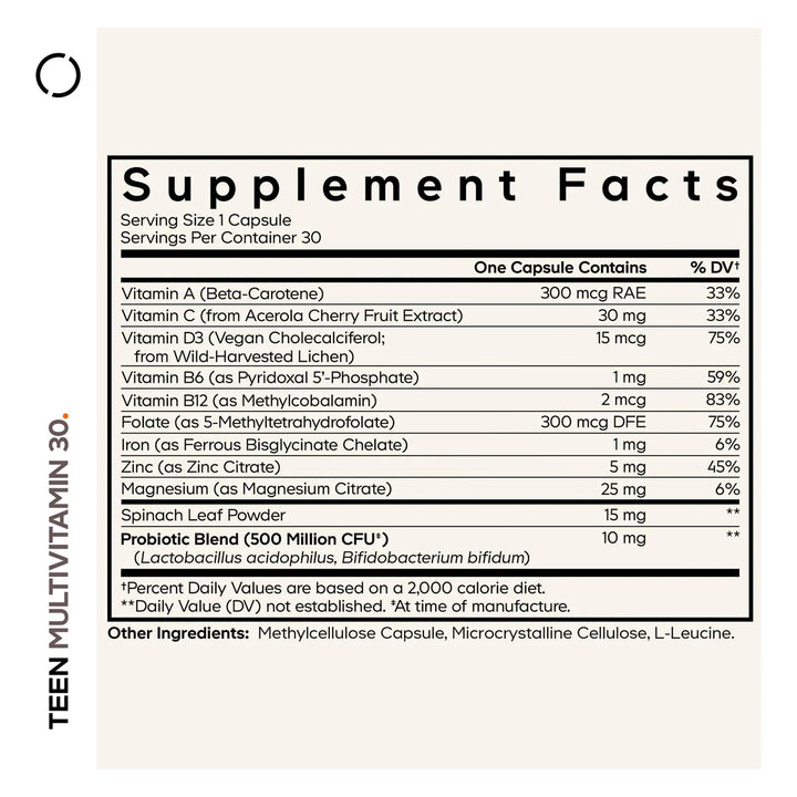 Este producto está diseñado para complementar la dieta de los adolescentes, proporcionando los nutrientes que pueden faltar en su alimentación diaria. La combinación de vitaminas y minerales apoya el crecimiento muscular, la salud ósea, la función cerebral y el sistema inmunológico. Los probióticos ayudan a mantener una digestión óptima, mientras que las espinacas fermentadas aumentan la biodisponibilidad de los nutrientes.