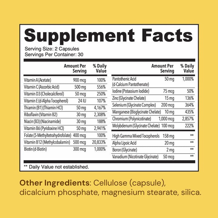 ¿Sientes que tu energía no es la misma de antes? ¿Te cuesta concentrarte o mantener una piel radiante? Las multivitaminas diarias queladas son la solución que estabas buscando. Diseñadas para hombres y mujeres adultos, este suplemento está repleto de 18 vitaminas y minerales esenciales, incluyendo zinc, biotina, yodo, cromo, manganeso y vitaminas A, B6, B12, C, D y E. Cada cápsula está formulada para brindarte la máxima biodisponibilidad, asegurando que tu cuerpo absorba todos los nutrientes que necesita.