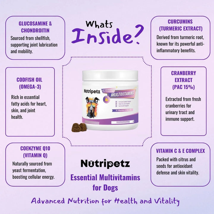 Tu perro se merece lo mejor, y este multivitamínico está repleto de ingredientes premium como CoQ10, ácidos grasos omega, glucosamina y condroitina, formulados para potenciar su vitalidad. ¿Preocupado por su digestión o esa picazón constante? La inulina y el extracto de arándano actúan como probióticos naturales, mientras los omega y vitaminas E y C reducen la irritación. Cada componente está pensado para que tu compañero de cuatro patas viva más y mejor.