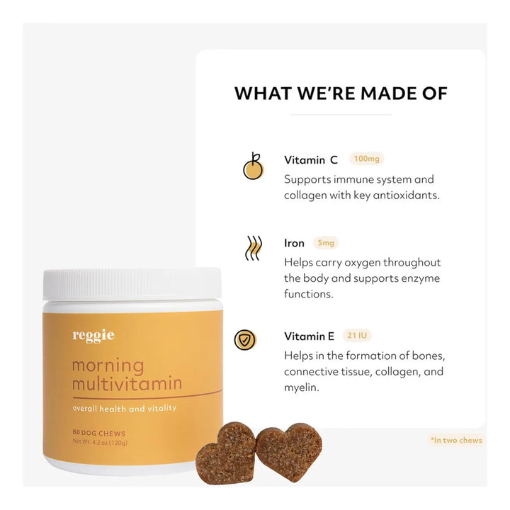 Nuestros masticables son ricos en vitamina C, vitamina E, hierro, ácido fólico y biotina, ingredientes esenciales para mantener a tu perro en óptimas condiciones. Además, su delicioso sabor hace que sea un regalo diario que tu mascota adorará. No más batallas para darle pastillas o líquidos desagradables. Con Reggie, la salud de tu perro será tan fácil como darle un premio.