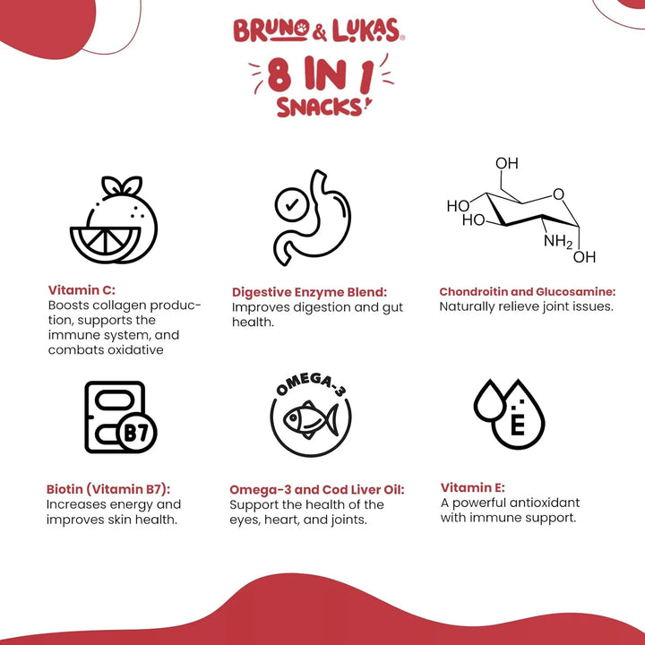 Las Multivitaminas Para Perros 8 En 1 actúan de manera integral en el organismo de tu mascota. La glucosamina ayuda a reparar y mantener el cartílago articular, mientras que los antioxidantes combaten los radicales libres que afectan su salud. El aceite de pescado nutre profundamente la piel y el pelaje desde dentro, y las vitaminas esenciales refuerzan su sistema inmunológico día tras día.