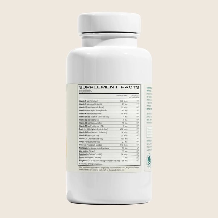Nuestras multivitaminas prenatales actúan desde el primer momento, proporcionando los nutrientes clave que tu cuerpo necesita para prepararse para el embarazo, mantenerlo saludable y recuperarte después. El folato y la colina son esenciales para el desarrollo del cerebro y el tubo neural de tu bebé, mientras que el hierro y las vitaminas B te ayudan a mantener tu energía y vitalidad.