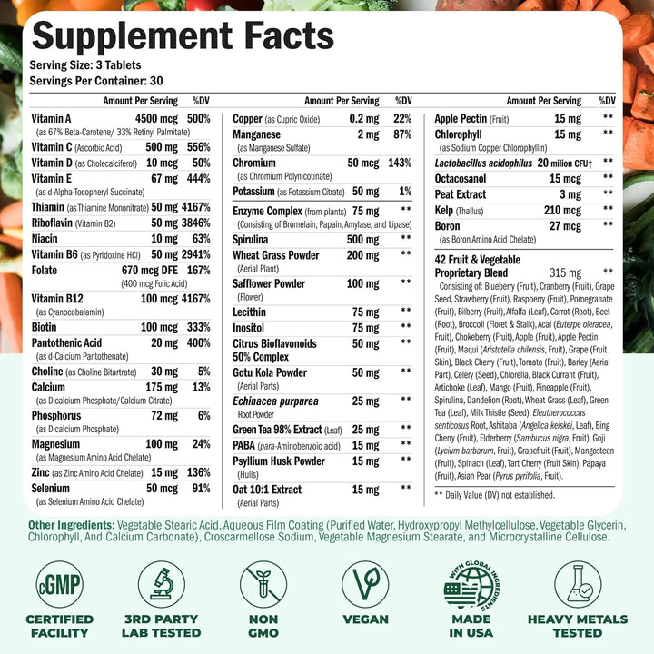 - 🌿 Nutrición Completa en una Sola Dosis: 23 vitaminas y minerales esenciales, desde la A hasta el zinc, para cubrir todas tus necesidades diarias.