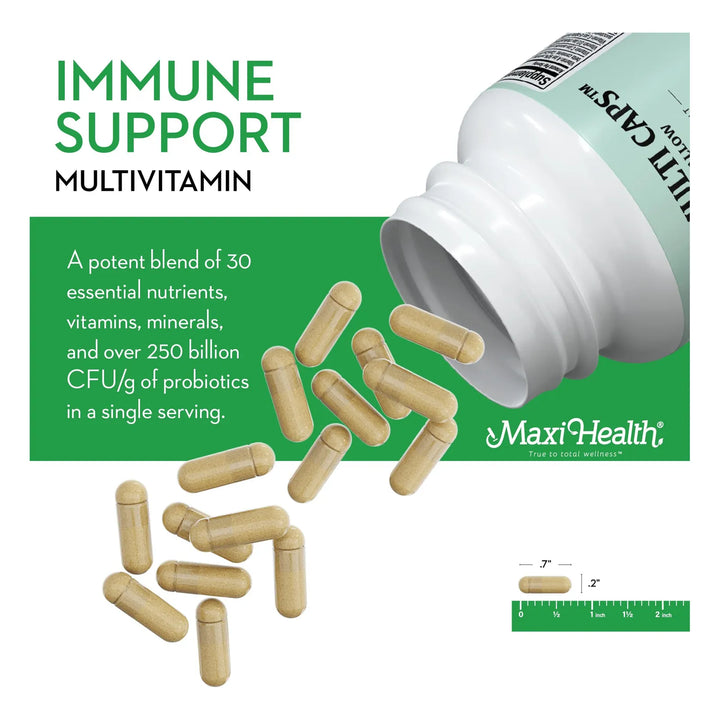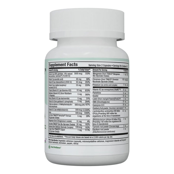 Con 30 nutrientes esenciales, incluyendo hierro altamente absorbible, probióticos para tu digestión y vitaminas clave para fortalecer tu sistema inmunológico, este multivitamínico es tu aliado diario. Olvídate de tomar múltiples pastillas; una sola cápsula fácil de tragar contiene todo lo que necesitas. Además, está certificado Kosher y libre de alérgenos comunes, porque tu bienestar no debería comprometerse.