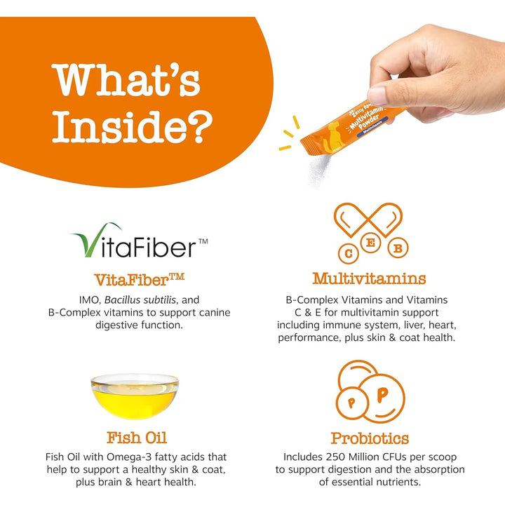 ¿Quieres lo mejor para tu peludo compañero pero no tienes tiempo para administrar múltiples suplementos? Imagina un producto que combine 10 beneficios esenciales en un solo polvo delicioso, diseñado para cuidar desde su sistema digestivo hasta su brillante pelaje. Este multivitamínico no solo ahorra tiempo y dinero, sino que también brinda a tu perro la nutrición que merece.