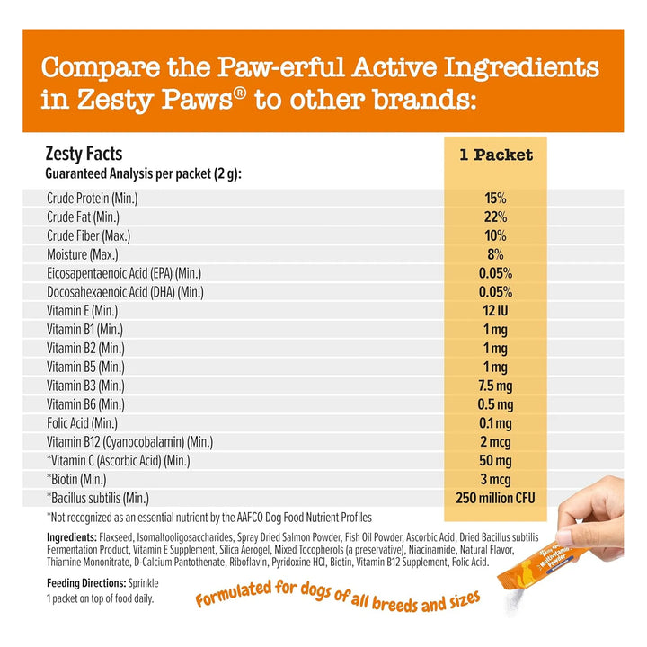 Cada cucharada de este suplemento está cargada de ingredientes premium como VitaFiber IMO, ácidos grasos omega del aceite de pescado y una mezcla poderosa de vitaminas C, E, B12 y biotina. Tu perro disfrutará de un sabor a salmón que lo hará ladrar de felicidad, mientras su cuerpo recibe el apoyo que necesita para mantenerse activo y saludable.