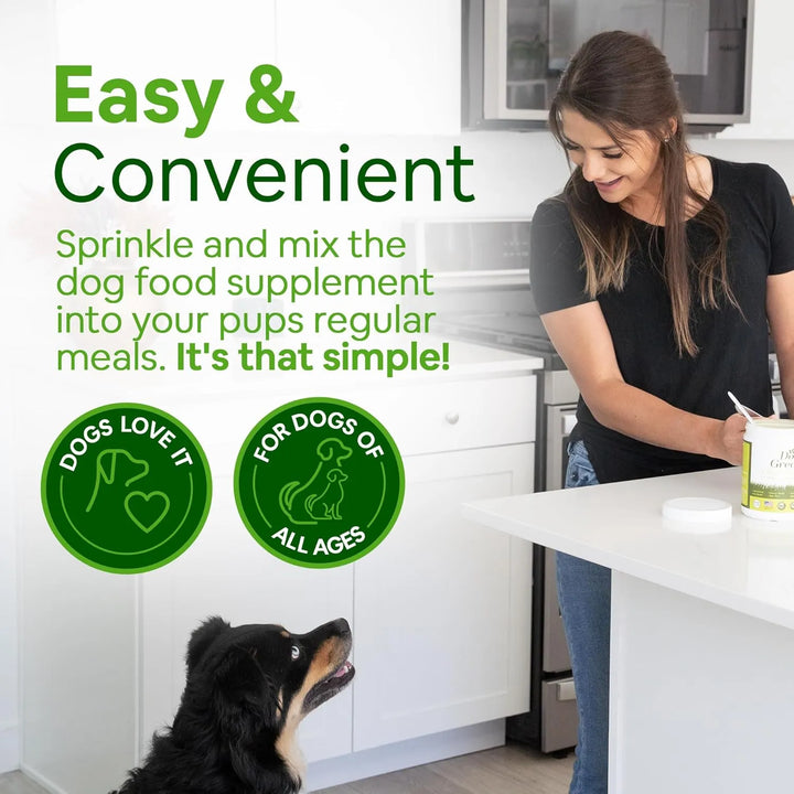 • Super Greens para súper perros: mantén las colas moviendo con el polvo multivitamínico para perros Dog Greens Repleto de superalimentos orgánicos y de cosecha silvestre, ofrece una potente mezcla de vitaminas, minerales, fibra y antioxidantes para perros para una salud y energía vibrantes