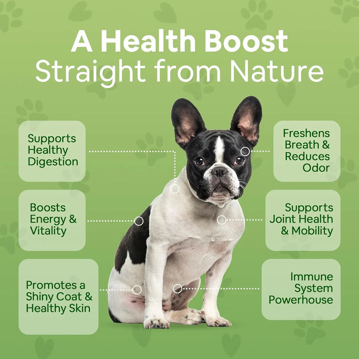 • Ingredientes de grado humano: fabricado con musgo marino irlandés orgánico, hierba de trigo y cebada, algas, clorella, alfalfa y espirulina de California, este suplemento en polvo para perros ofrece nutrientes biodisponibles que tu mascota puede absorber fácilmente, sin rellenos ni sintéticos
