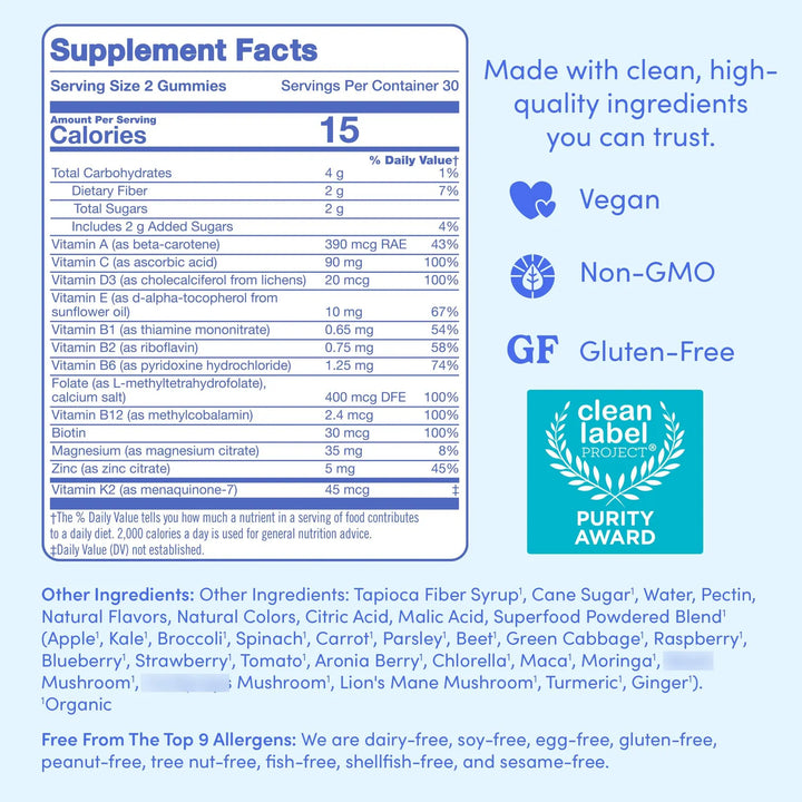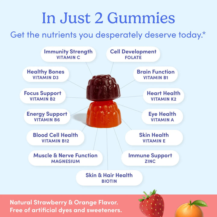 Imagina despertar cada día con la vitalidad de tus mejores años, listo para conquistar tus metas. Nuestras gomitas multivitamínicas combinan 13 nutrientes esenciales con una mezcla orgánica de frutas y verduras, creadas para apoyar tu estilo de vida activo. Desde mejorar tu claridad mental hasta fortalecer tu sistema inmunológico, este producto es tu aliado para rendir al 100%.