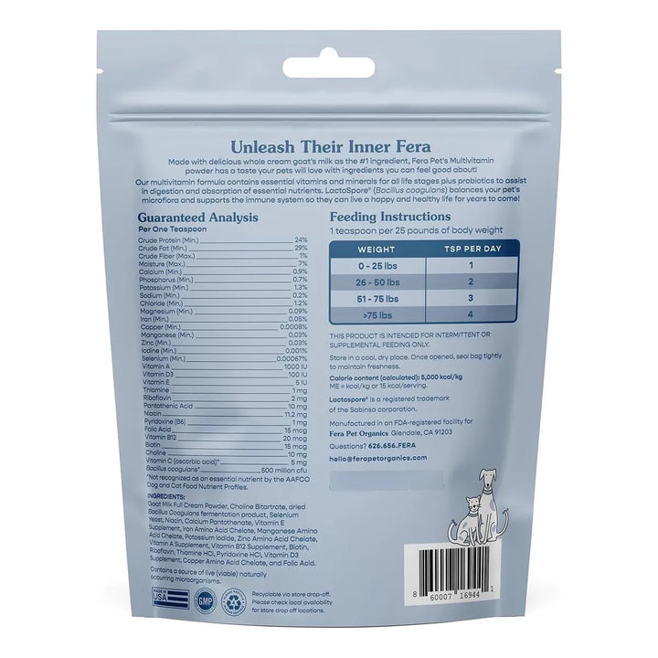 Imagina ver a tu mascota llena de energía, con un pelaje brillante y una salud envidiable. Con el Multivitamínico de Leche de Cabra de Fera Pet Organics, eso es posible. Este suplemento, formulado por veterinarios, está diseñado para brindar a tu compañero peludo todos los nutrientes esenciales que necesita para mantenerse activo y feliz. No es solo un multivitamínico, es un compromiso con su bienestar.