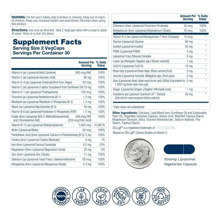 Imagina un suplemento que no solo te brinda las vitaminas y minerales esenciales, sino que asegura que tu cuerpo los absorba de manera óptima. Gracias a la revolucionaria tecnología liposomal, cada nutriente está protegido para llegar directamente a tus células, maximizando sus beneficios. Olvídate de las vitaminas tradicionales que se pierden en el camino; esta fórmula avanzada está diseñada pensando en tus necesidades específicas.