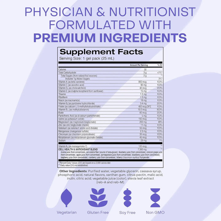 Este no es otro suplemento más. Es una revolución en nutrición. Con ingredientes 100% naturales, sin OMG, sin gluten y sin alérgenos, cada paquete de gel está repleto de vitaminas esenciales como D3, B12, A, E, K, C y minerales clave para que tu cuerpo funcione en su máximo potencial. ¿Lo mejor? Su delicioso sabor a melocotón y mango hace que tomarlo sea un placer, no una tarea.