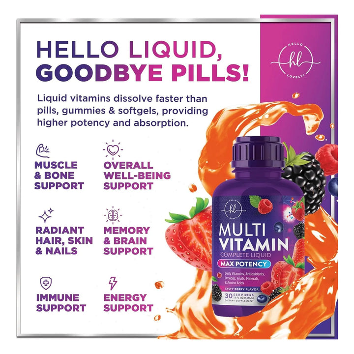 ¿Cansado de sentirte agotado, con la piel opaca o el cabello sin vida? Imagina despertar cada mañana con energía radiante, sintiéndote fuerte, saludable y lleno de vitalidad. Nuestro Multivitamínico Líquido Diario está diseñado para hombres y mujeres que buscan una solución rápida, efectiva y deliciosa para nutrir su cuerpo desde adentro hacia afuera.