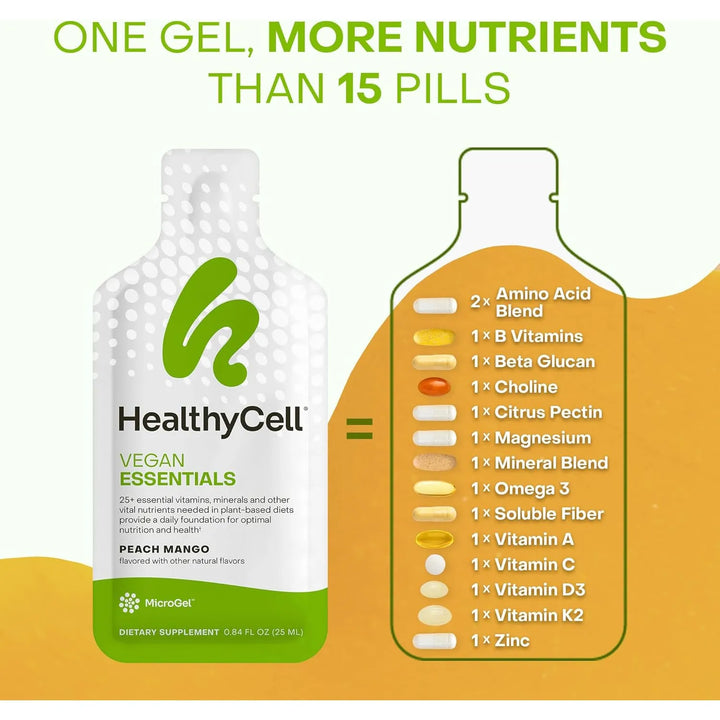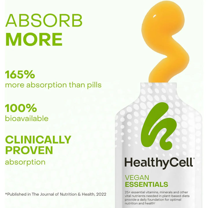 El Multivitamínico Líquido Healthycell Vegan Essentials utiliza una tecnología avanzada llamada MicroGel, que permite una absorción óptima de nutrientes. Al ser líquido, los ingredientes activos llegan más rápido a tu torrente sanguíneo, proporcionando beneficios casi inmediatos. Su combinación única de vitaminas, minerales y omega-3 trabaja sinérgicamente para mejorar tu salud cerebral, cardiovascular y cutánea.