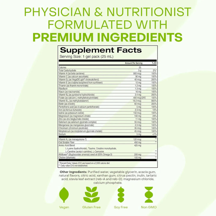 Con más de 25 vitaminas, minerales y nutrientes esenciales, este multivitamínico líquido está especialmente formulado para apoyar la salud de tu cerebro, corazón y piel. Su fórmula clínicamente probada ofrece un 165% más de absorción que las tabletas tradicionales, lo que significa que cada gota trabaja más eficientemente en tu cuerpo. ¿Por qué conformarte con menos cuando puedes tener lo mejor?