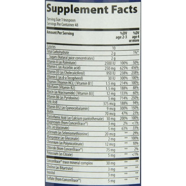 Este multivitamínico líquido está diseñado para complementar la dieta diaria de los niños, proporcionando nutrientes clave que pueden faltar en sus comidas. Su fórmula avanzada incluye electrolitos y minerales iónicos que el cuerpo absorbe rápidamente, apoyando la inmunidad, el desarrollo óseo y la energía.
