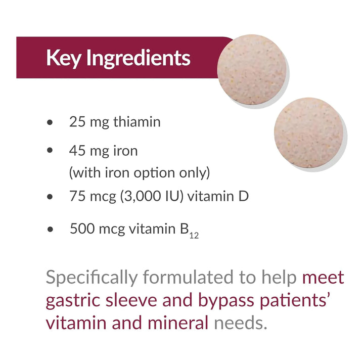 Este multivitamínico está diseñado para compensar las deficiencias nutricionales comunes después de una cirugía bariátrica. Su fórmula avanzada incluye hierro y vitaminas en formas que tu cuerpo puede absorber fácilmente, incluso con un sistema digestivo modificado. Al tomarlo diariamente, ayudas a prevenir anemias, fatiga crónica y otras complicaciones, permitiéndote enfocarte en tu recuperación y bienestar.