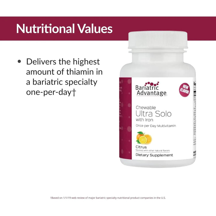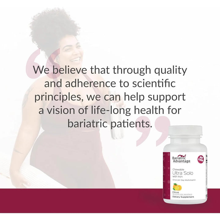 ¿Te preocupa no obtener los nutrientes esenciales después de tu cirugía bariátrica? Sabemos lo difícil que puede ser mantener una nutrición adecuada cuando tu cuerpo necesita más que nunca vitaminas y minerales clave. Por eso, Bariatric Advantage Masticable Ultra Solo con Hierro está aquí para simplificar tu vida y asegurar que cada día cuentes con lo necesario para una recuperación óptima.