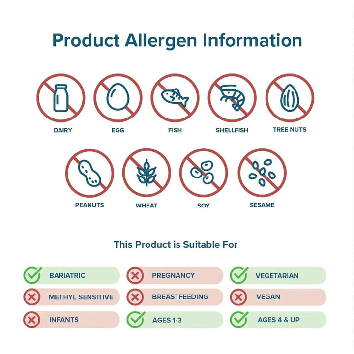 Este multivitamínico está diseñado para proporcionar una dosis equilibrada de nutrientes esenciales que los niños necesitan diariamente. El L-metilfolato y la B12 apoyan la metilación, un proceso clave para el desarrollo del sistema nervioso y la producción de energía. Los minerales quelados aseguran una absorción óptima, mientras que las vitaminas antioxidantes protegen las células del daño oxidativo.