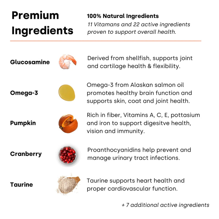 Este multivitamínico está diseñado para complementar la dieta de tu perro, proporcionando los nutrientes esenciales que pueden faltar en alimentos crudos o caseros. Los ingredientes activos, como los omegas y la glucosamina, trabajan juntos para mejorar la salud articular, mientras que las vitaminas y minerales fortalecen el sistema inmunológico y promueven una digestión saludable.