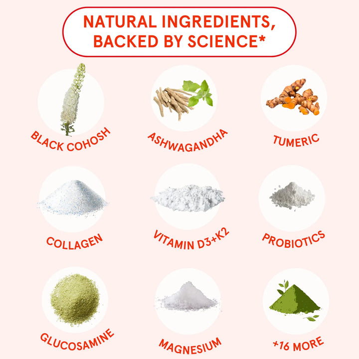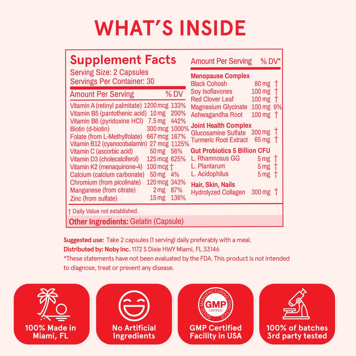 Imagina despertar cada mañana con más vitalidad, menos sofocos y una piel radiante. Este no es un multivitamínico común: incluye ingredientes como cohosh negro, ashwagandha y colágeno hidrolizado, seleccionados cuidadosamente para abordar los cambios únicos que experimenta tu cuerpo durante la menopausia. No solo te ayuda a sentirte mejor por dentro, sino que también cuida tu belleza exterior.