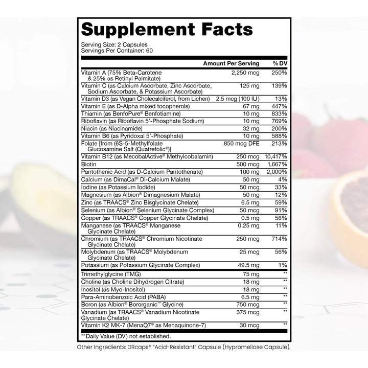 La mayoría de los multivitamínicos contienen formas sintéticas de nutrientes que muchos cuerpos no pueden procesar correctamente. Nuestra fórmula utiliza formas metiladas, es decir, nutrientes que ya están en el estado que tu cuerpo puede usar inmediatamente. No más desperdicio, no más pastillas que pasan por tu sistema sin aportar beneficios reales.