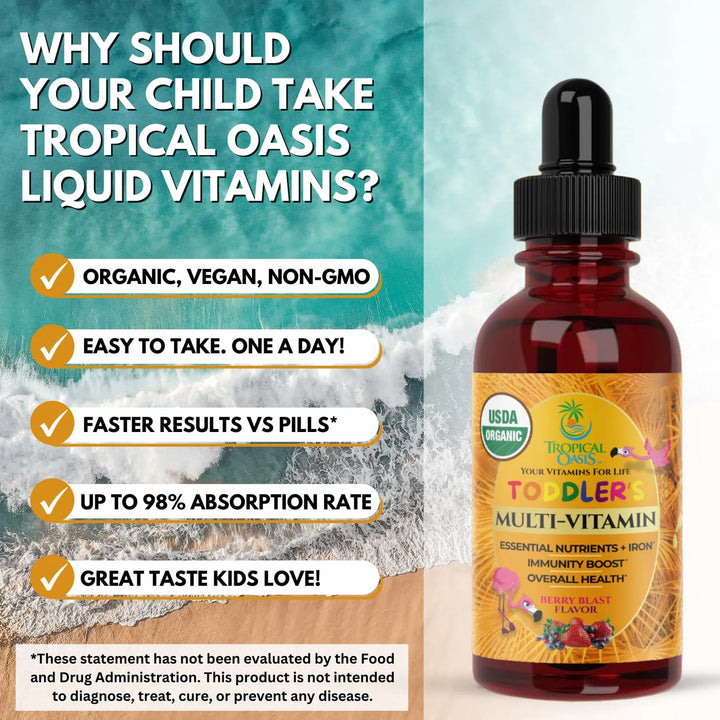 Este producto no es solo otra vitamina más. Es una fórmula cuidadosamente elaborada con ingredientes orgánicos certificados por USDA, garantizando que cada gota esté libre de químicos dañinos. Con una tasa de absorción del 98%, supera a las vitaminas en pastilla, asegurando que tu hijo aproveche al máximo cada nutriente.