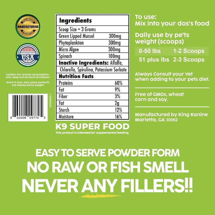 ¿Quieres ver a tu perro lleno de energía, con articulaciones fuertes y libre de alergias? El Multivitamínico Orgánico King Kanine Green Inmune Plus es la solución que estabas buscando. Diseñado para perros de todas las razas y edades, este suplemento en polvo no solo mejora su movilidad, sino que también fortalece su sistema inmunológico, ayudándolo a combatir alergias y mantener una salud óptima. Imagina a tu compañero jugando sin molestias, con un pelaje brillante y esa vitalidad que tanto amas. ¡Eso es lo que este producto puede lograr!