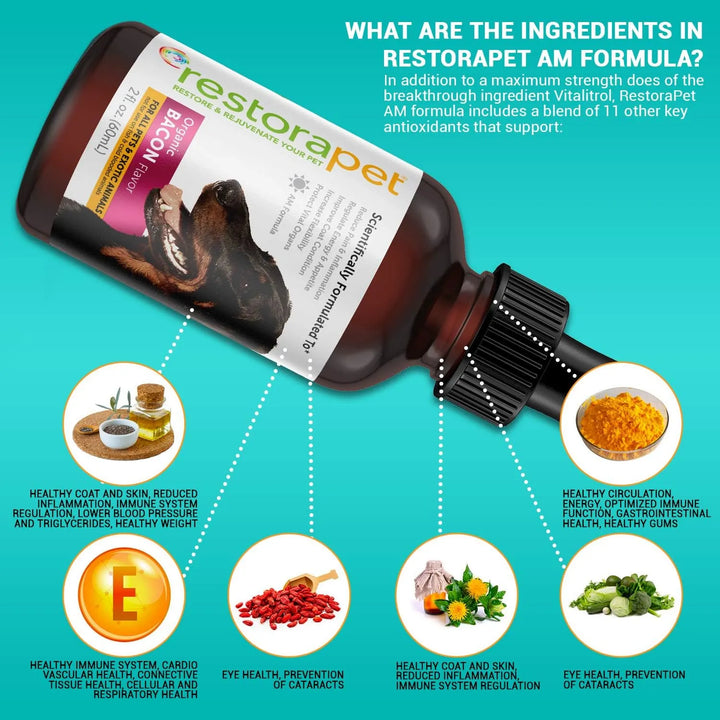 • A tu mascota le encantarán las deliciosas gotas líquidas. A diferencia de otros suplementos nutricionales de baja calidad para perros que tienen un olor y sabor horribles, el suplemento líquido definitivo de RestoraPet para mascotas no tiene sabor y viene con un gotero calibrado, por lo que es muy fácil de administrar.