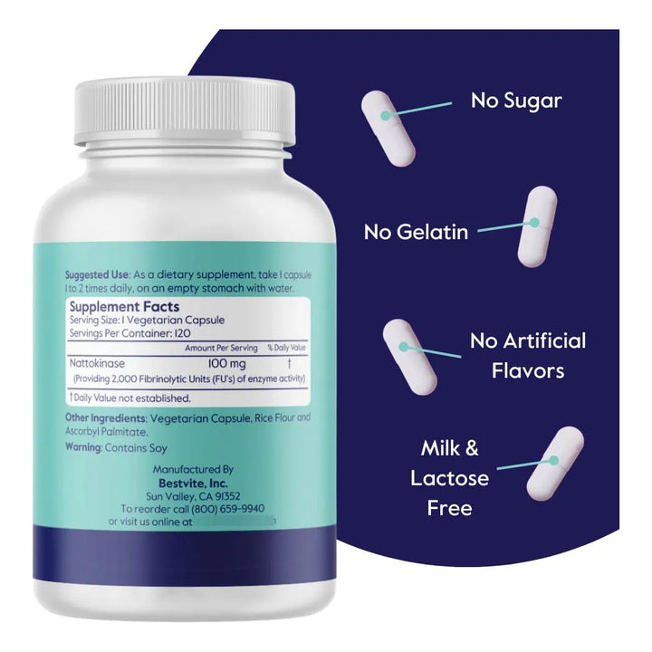 Nattokinase 100mg de Bestvite no es un suplemento cualquiera. Es una enzima poderosa derivada del natto, un alimento tradicional japonés conocido por sus beneficios únicos. Cada cápsula está diseñada para ofrecerte 2,000 unidades fibrinolíticas (FU) de actividad enzimática, asegurando que tu cuerpo reciba exactamente lo que necesita para promover un flujo sanguíneo saludable y una circulación óptima.