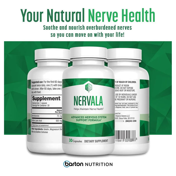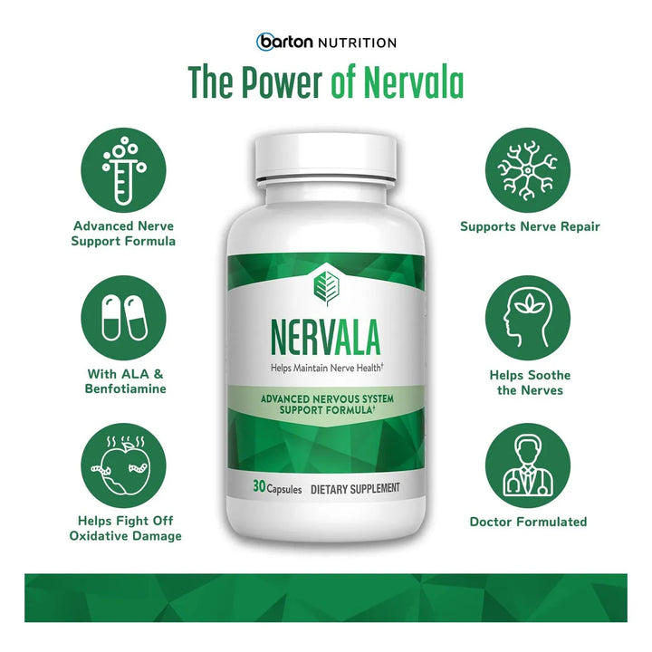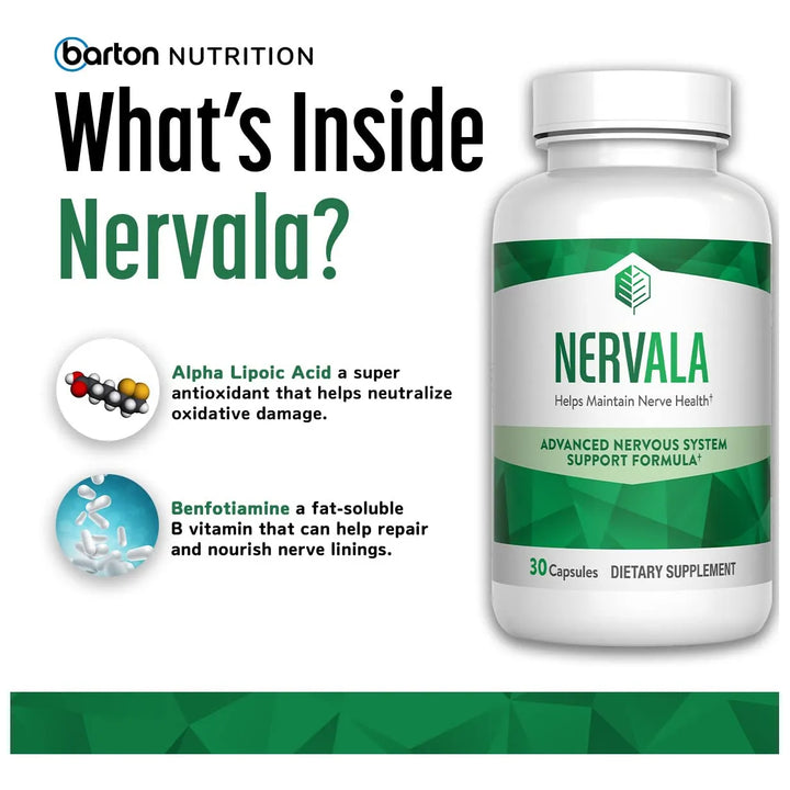 Mientras otros suplementos solo ofrecen alivio temporal, Nervala aborda la causa subyacente del daño nervioso. Su combinación de Ácido Alfa Lipoico y Benfotiamina (una forma superior de vitamina B1) trabaja sinérgicamente para reducir la inflamación, proteger tus nervios y promover su regeneración. Además, está formulado por el Dr. Scott Saunders, un experto en medicina integrativa, lo que garantiza un equilibrio perfecto entre ciencia y bienestar.