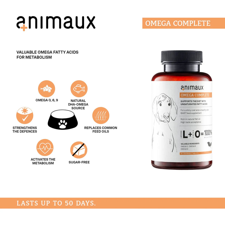Cada tableta de Omega Complete está formulada con una combinación única de Omega 3, 6 y 9, provenientes exclusivamente de aceite de pescado de captura silvestre. Estos ingredientes no solo mejoran la apariencia de tu perro, sino que también fortalecen su sistema inmunológico y promueven una estructura ósea sólida. Es el complemento perfecto para una dieta BARF o cualquier alimentación regular.