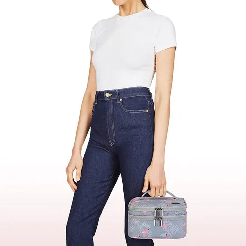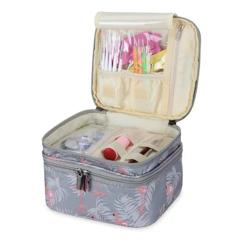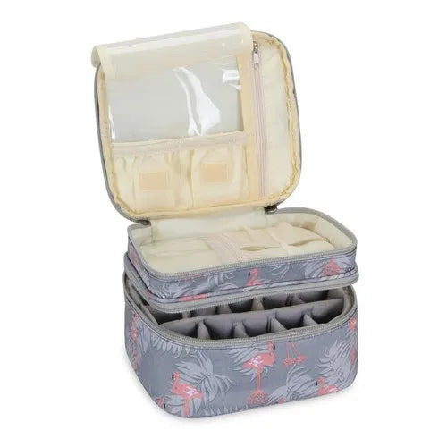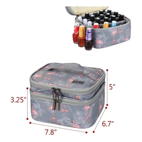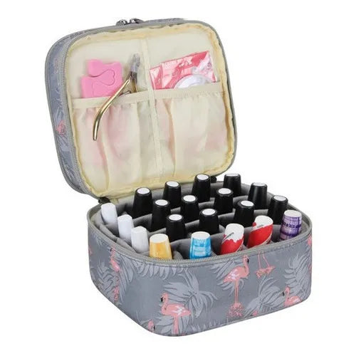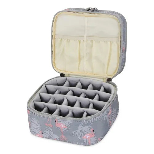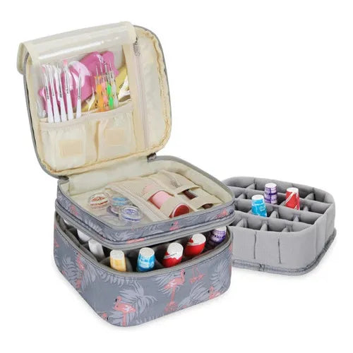 El organizador utiliza un sistema de doble nivel con divisores inteligentes que mantienen cada frasco en su lugar. La capa superior se desliza suavemente para revelar la inferior, permitiendo visualizar toda tu colección sin esfuerzo. Los bordes elevados evitan que los esmaltes rueden, incluso cuando el organizador está lleno.