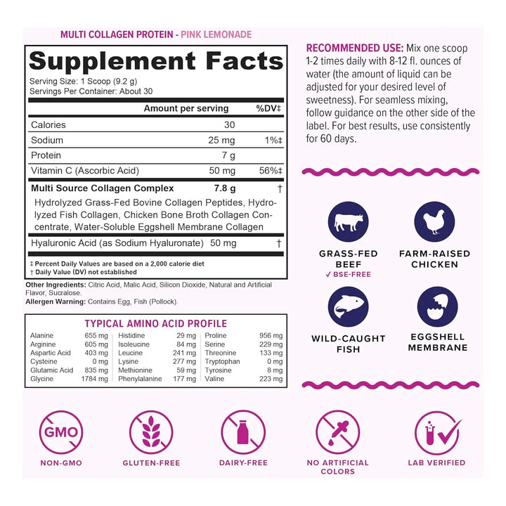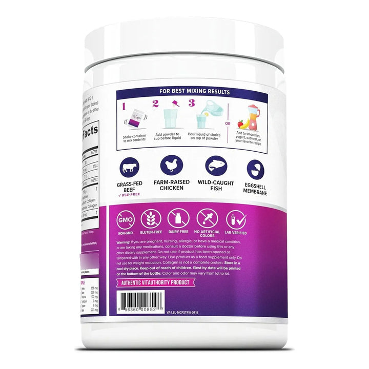 Este producto no es cualquier suplemento de colágeno. Está formulado con péptidos de colágeno aglomerado de primera calidad, que se disuelven al instante en cualquier líquido, ya sea frío o caliente. Además, proviene de fuentes 100% naturales: carne vacuna alimentada con hierba, pollo de crianza libre, mariscos silvestres y cáscara de huevo. Sin gluten, soja, OMG ni lácteos, es la opción perfecta para quienes buscan un estilo de vida saludable y consciente.