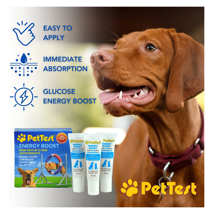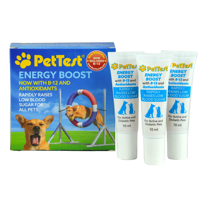 El gel de glucosa PetTest New Energy Boost está diseñado para ser absorbido directamente por las encías de tu mascota, lo que permite que los niveles de azúcar en la sangre se normalicen en cuestión de minutos. La dextrosa actúa como fuente de energía instantánea, mientras que la vitamina B12 y los antioxidantes ayudan a mantener un metabolismo saludable.