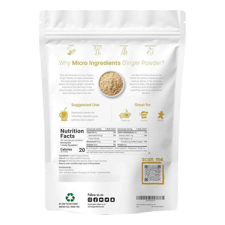 Este polvo de jengibre, finamente molido y de origen orgánico, está diseñado para integrarse fácilmente en tus recetas favoritas. Ya sea para hornear, cocinar o preparar un té reconfortante, su textura suave y su intenso aroma te sorprenderán. Sin OMG, sin conservantes y sin gluten, es la elección ideal para cuidar tu salud y la de tu familia.