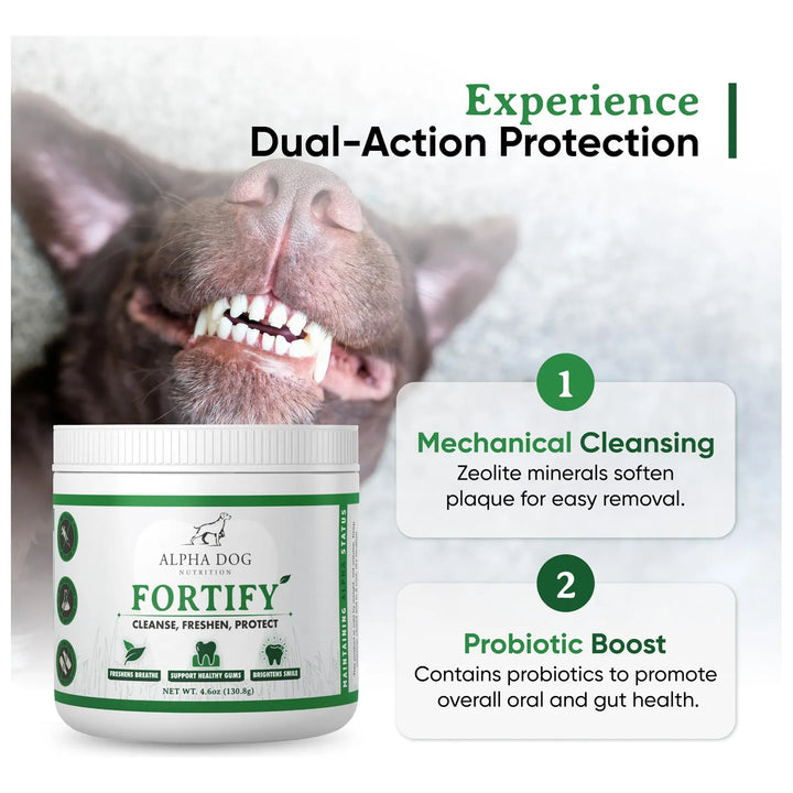El Polvo Dental Fortify actúa en tres pasos mágicos: 1) Sus partículas naturales se adhieren al sarro y la placa, disolviéndolos suavemente. 2) Los probióticos equilibran la flora bucal, eliminando bacterias causantes del mal olor. 3) Las algas fortalecen las encías, previniendo sangrados e inflamaciones. ¡Todo mientras tu perro disfruta su comida!
