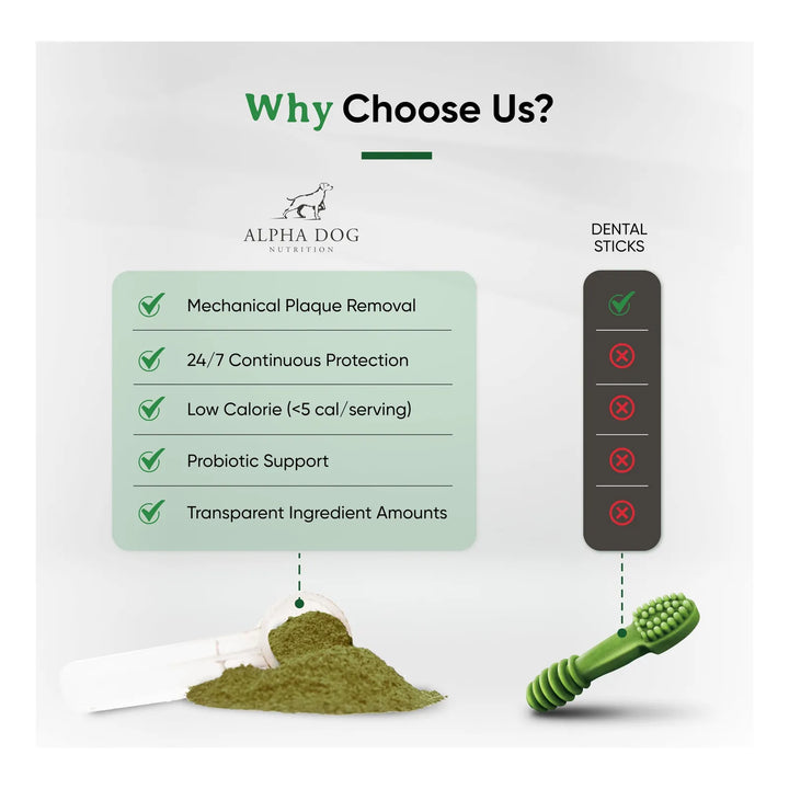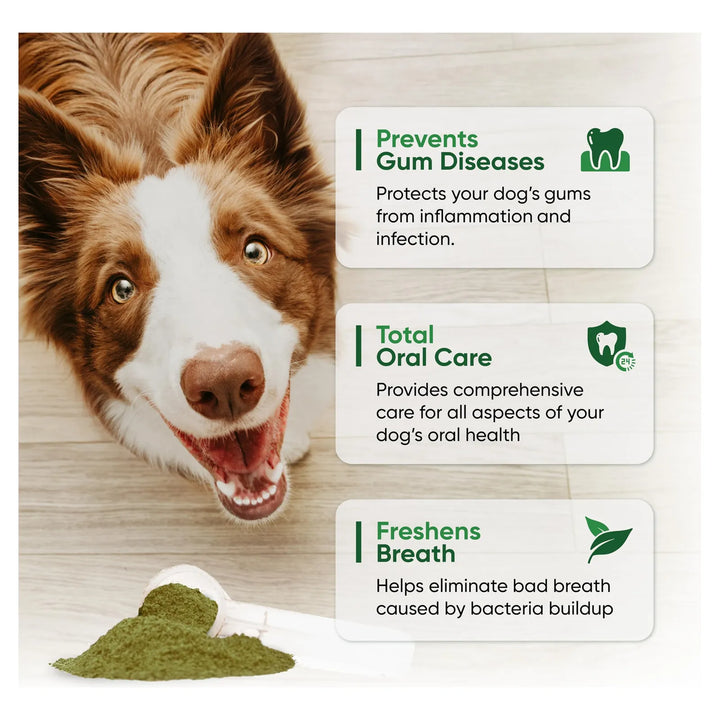 Nuestro polvo dental está formulado por doctores y respaldado por veterinarios, combinando ingredientes naturales como algas y probióticos para combatir la placa, refrescar el aliento y fortalecer las encías. ¿Lo mejor? No requiere cepillado, ahorrándote tiempo y estrés. Tu perro merece una sonrisa saludable, y tú mereces la tranquilidad de saber que lo estás protegiendo de problemas futuros.