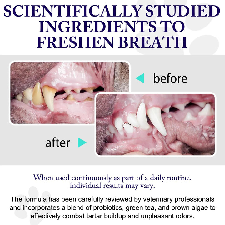 - 🌿 Fórmula con probióticos: Equilibra la flora bucal y combate las bacterias causantes del mal olor, respaldado por veterinarios.