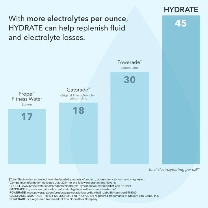 Imagina entrenar con energía inagotable, recuperarte más rápido y sentir cada músculo listo para el próximo desafío. Hydrate no es un suplemento cualquiera: combina 4 electrolitos clave (potasio, magnesio, sodio y calcio) con quercetina, un fitonutriente científicamente respaldado, para llevarte más allá de lo que creías posible.
